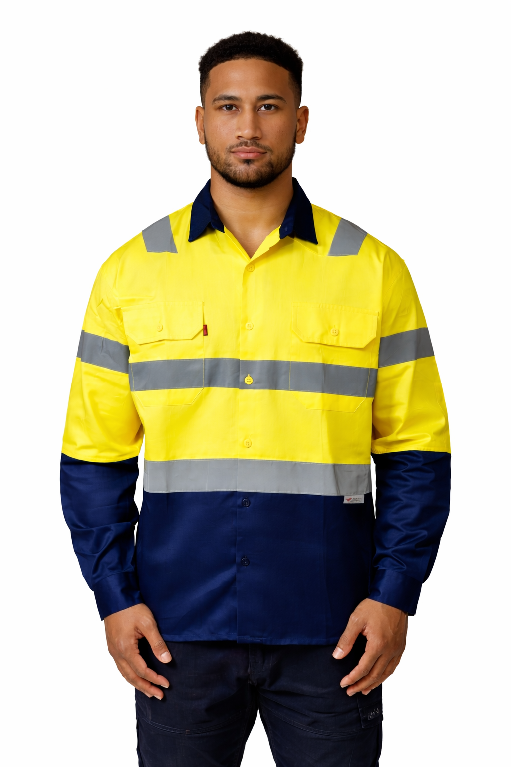 Taped cotton shirt with under arm cotton mesh vents Two tapes on shoulders and two on body Two botton pockets on chests One pen pocket on the left arm