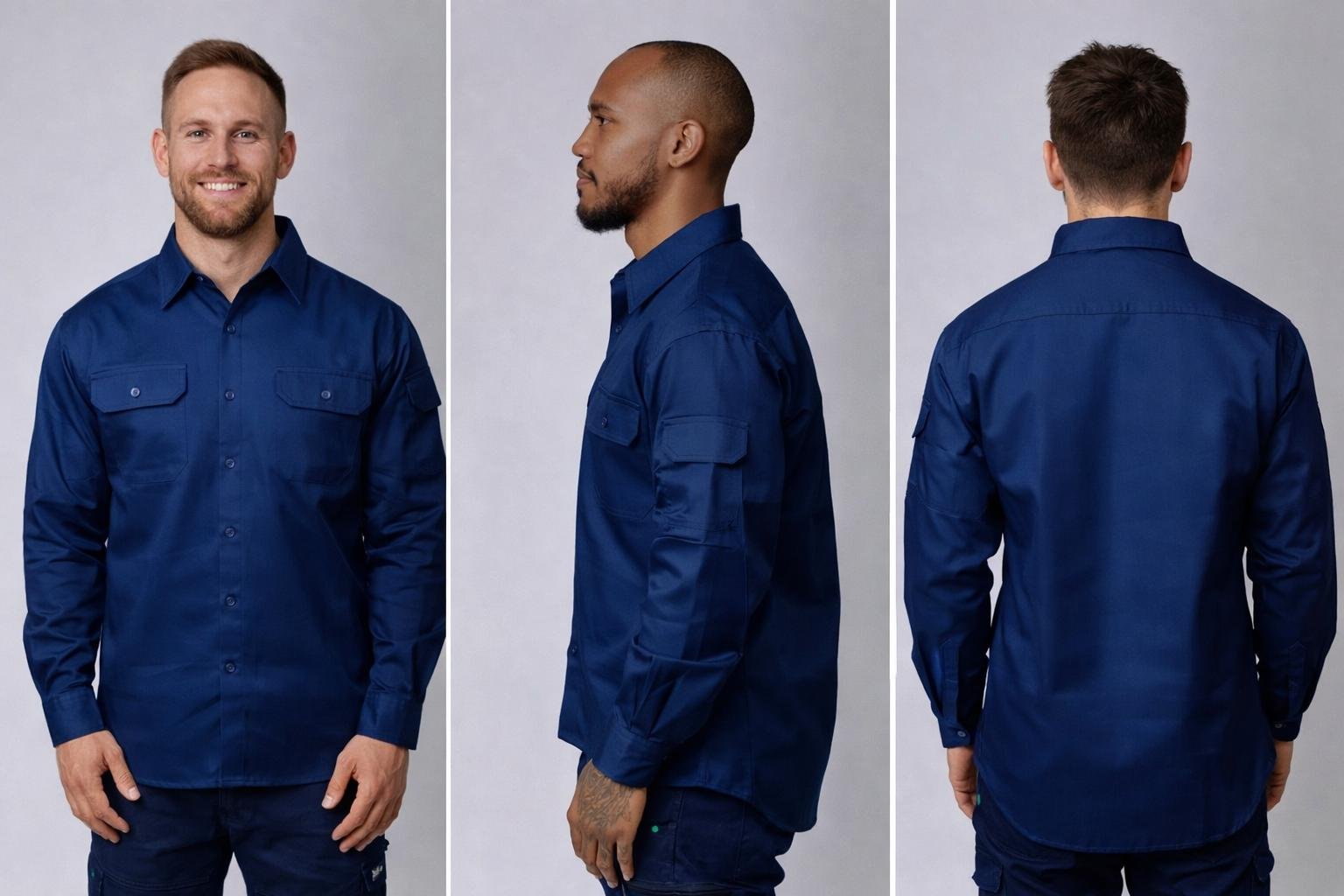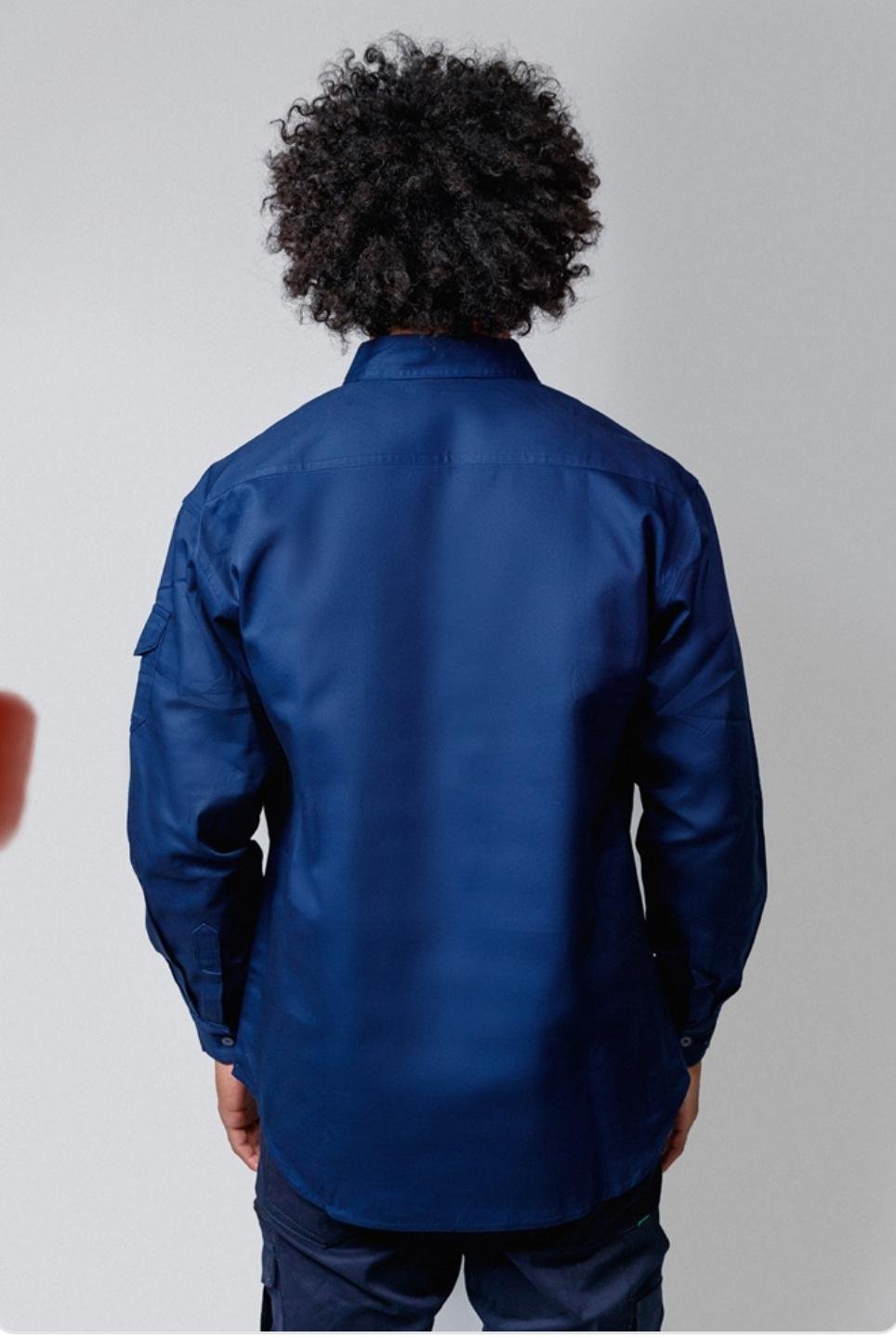 Long sleeve cotton with under arm cotton mesh vents Two botton pockets on chests One pen pocket on the left arm