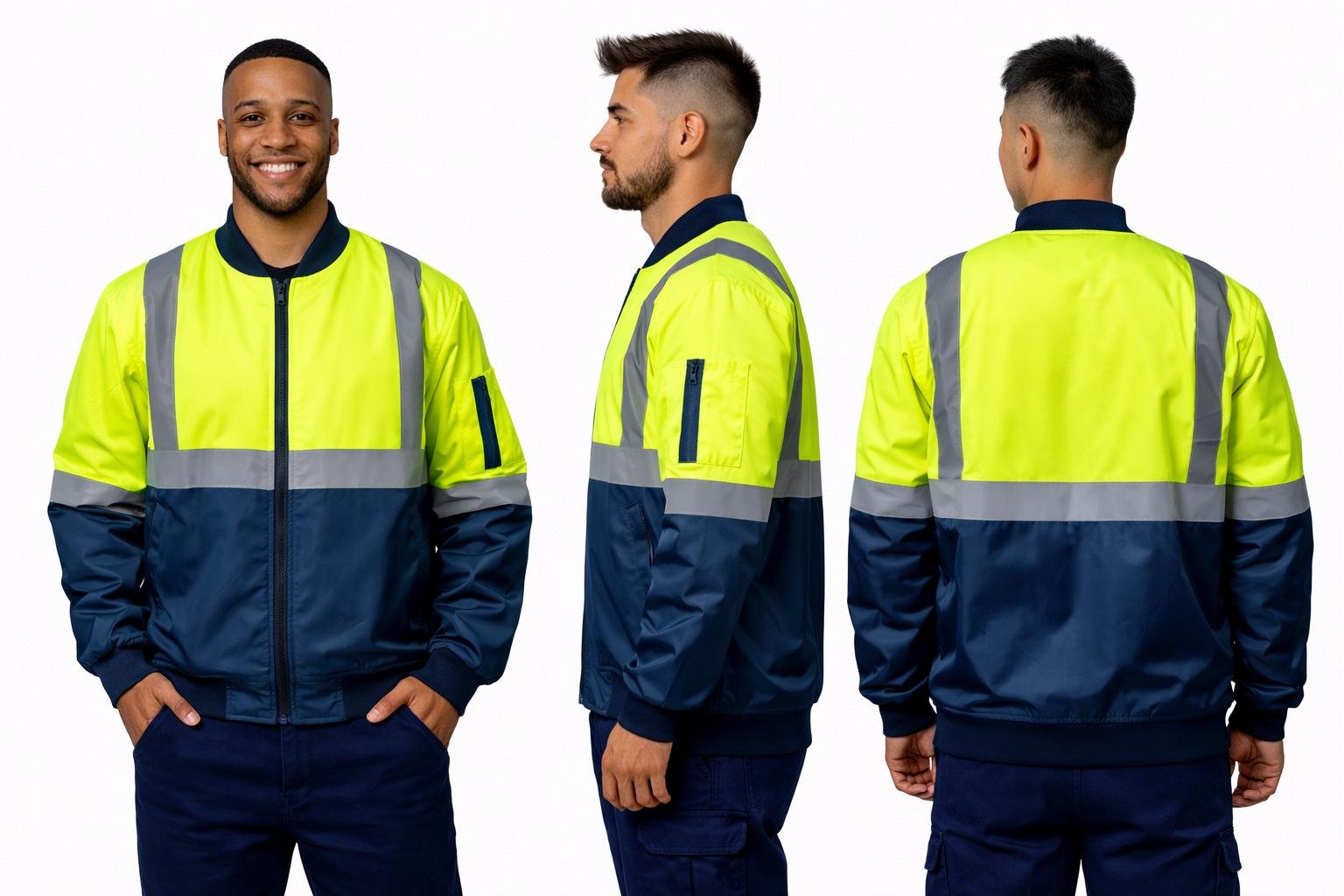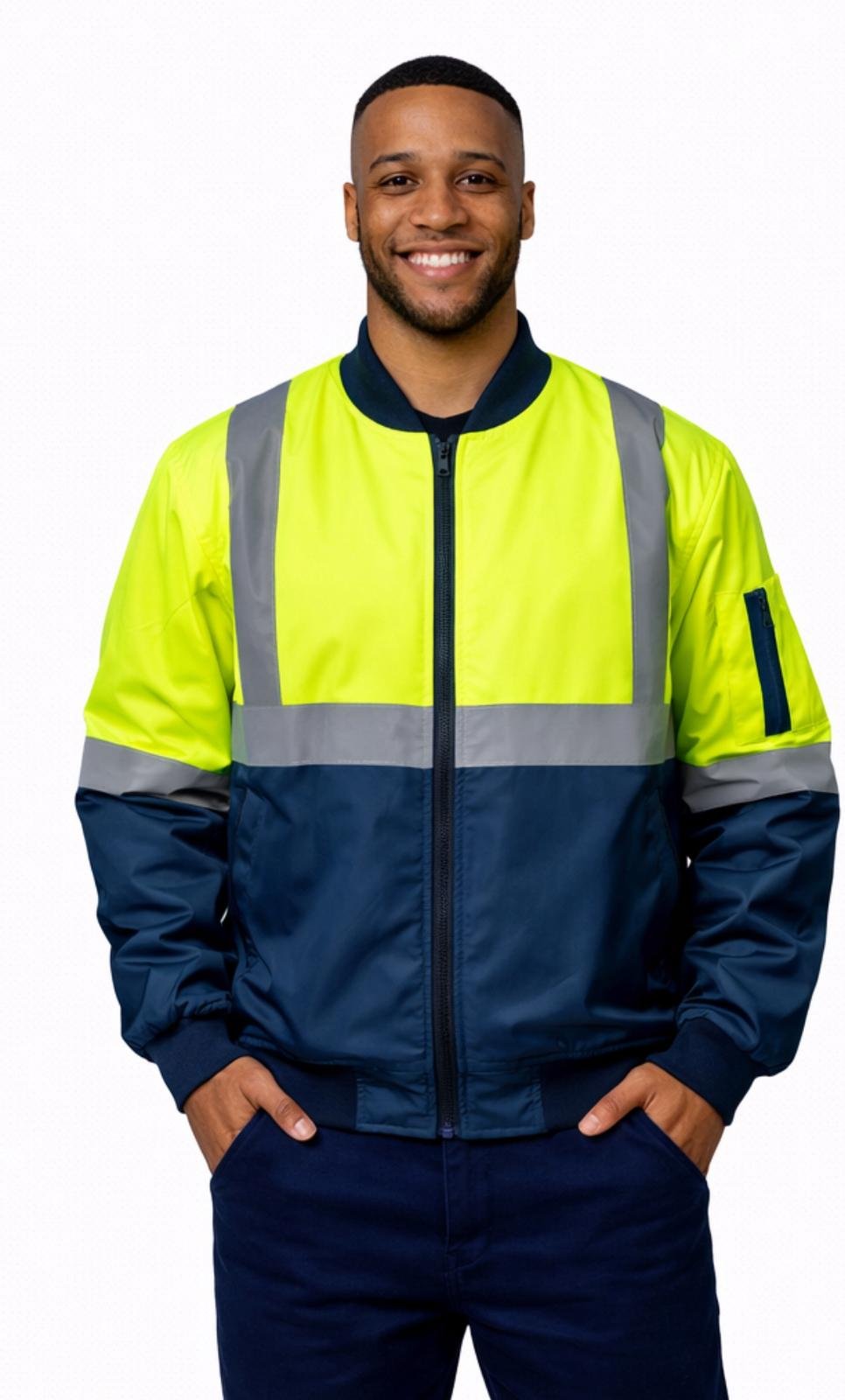\n 100% polyester with reflective tape \n Waterproof outer shell \n Quilted lining \n 2 side pocket, 1 inside pocket, 1 arm pocket \n